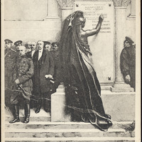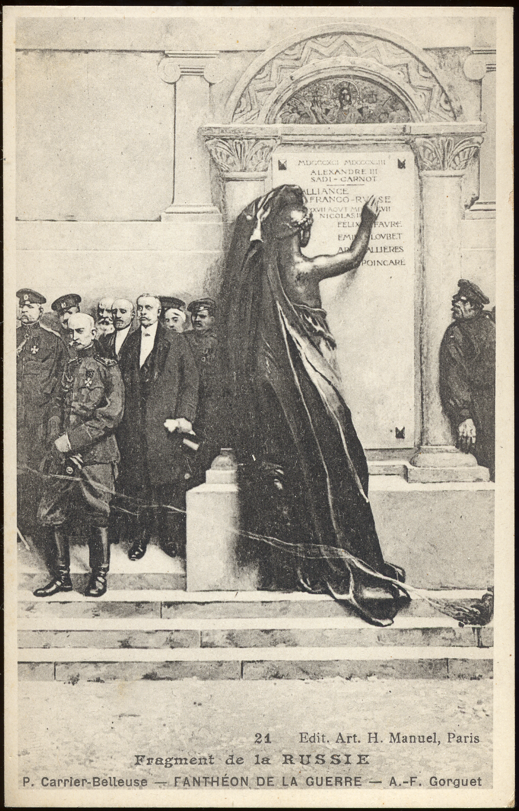 This postcard is a black and white picture of men standing by a statue. Text on wall behind statue: "MDCCCXCI MDCCCXCIII / Alexandre III/ Sadi-Carnot / Alliance Franco-Ru[s]se" The statue partially obscures other text. Text at bottom right: "Edit. Art. H. Manuel, Paris". Text at bottom center: "Fragment de la Russie"; "P. Carrier-Belleuse -- Panthéon de la Guerre -- A.-F. Gorguet". On reverse: "Imp. E. Le Deley, Paris".
