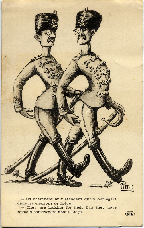 - This postcard is a black and white cartoon of two soldiers walking with their chests stuck out. Text at bottom right of picture: "Pierre". Text at bottom center: "--Ils cherchent leur étendard qu'ils ont égaré/dans les environs de Liège./--They are looking for their flag and they have/mislaid somewhere about Liege." On reverse: blank.