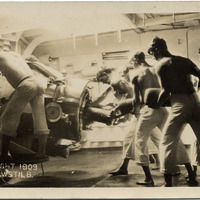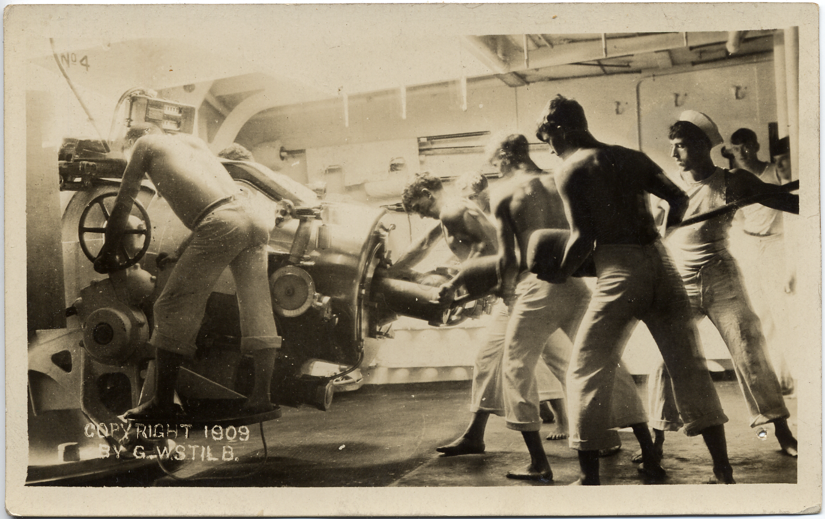 This postcard is a black and white photo of sailors loading a cannon. Text at bottom left: "Copyright 1909 by G.W. Stilb." On reverse: blank.