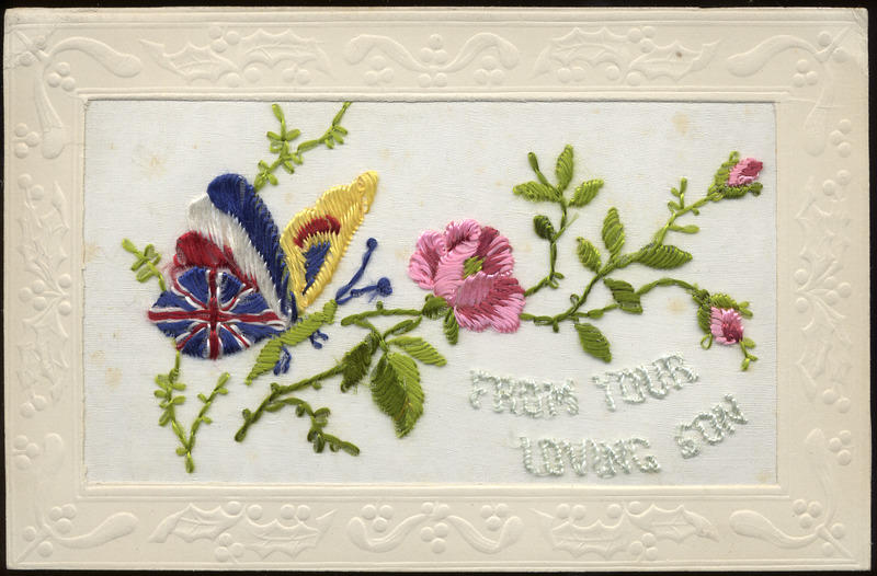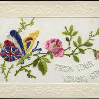 - This postcard has embroidered flowers and a butterfly; the wings are flags; "From Your Loving Son" embroidered in the bottom right corner. On reverse: "Fabrication Française"; handwritten message.