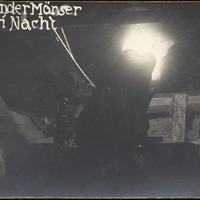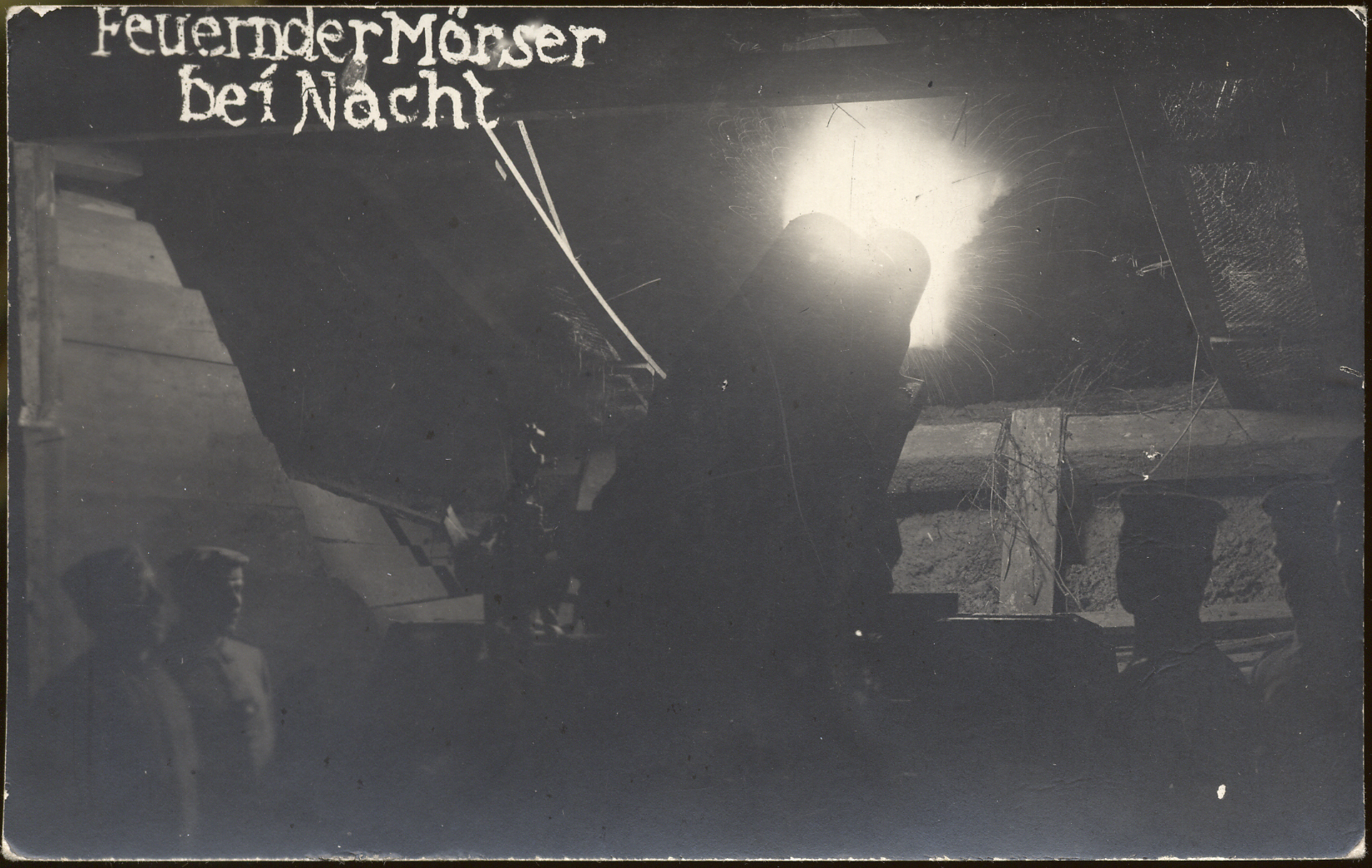 - This postcard is a black and white photo of a cannon firing at night from within a trench. Text at top left: "Feuernder Mörser bei Nacht". On reverse: blank.
