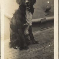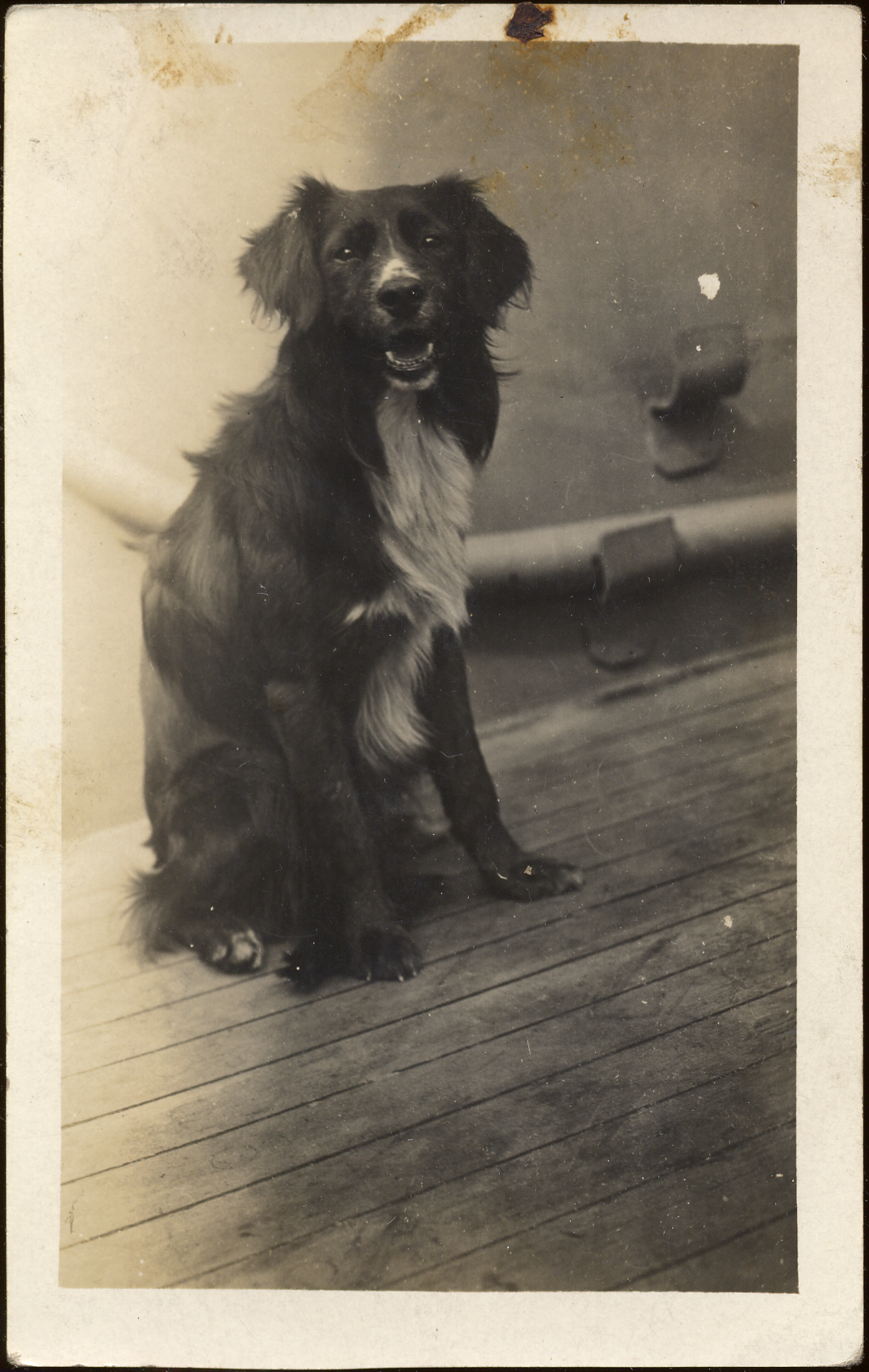 This postcard is a black and white photo of a black dog with a white chest. On reverse: blank.