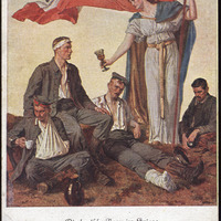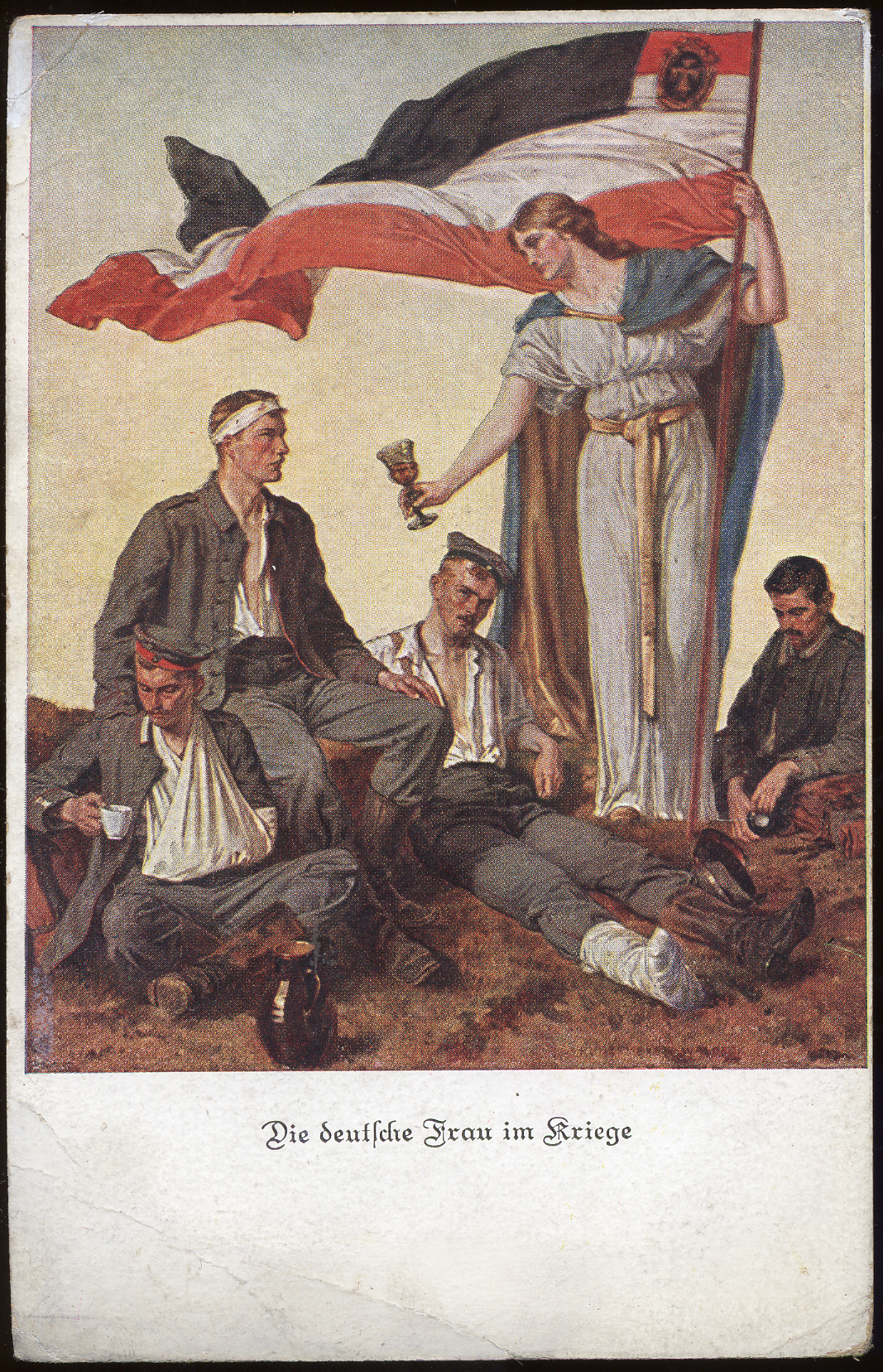 - This postcard has a color illustration of a woman in Greek/Roman dress holding a flag and handing a cup to a wounded soldier. Three other wounded soldiers sit on the ground beside him. Text beneath picture: "Die deutsche Frau im Kriege". On reverse: "Bayer. Landeskomitee für freiwillige Krankenpflege im Kriege"; "Offizielle Postkarte".