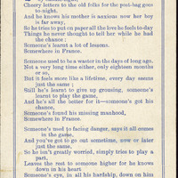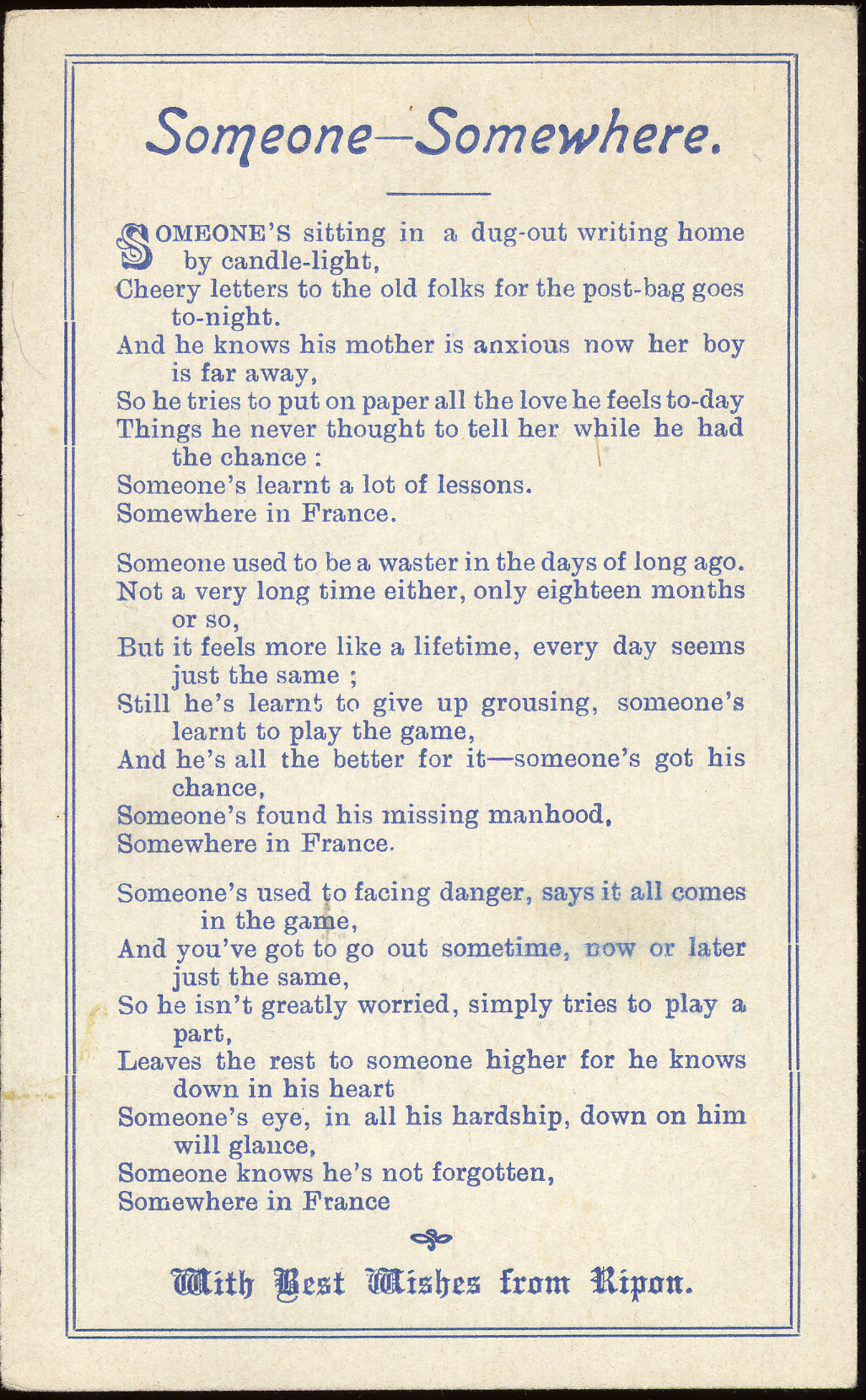- This postcard has a long poem entitled "Someone--Somewhere" about a soldier in France. Text at bottom center: "With Best Wishes from Ripon." On reverse: blank.