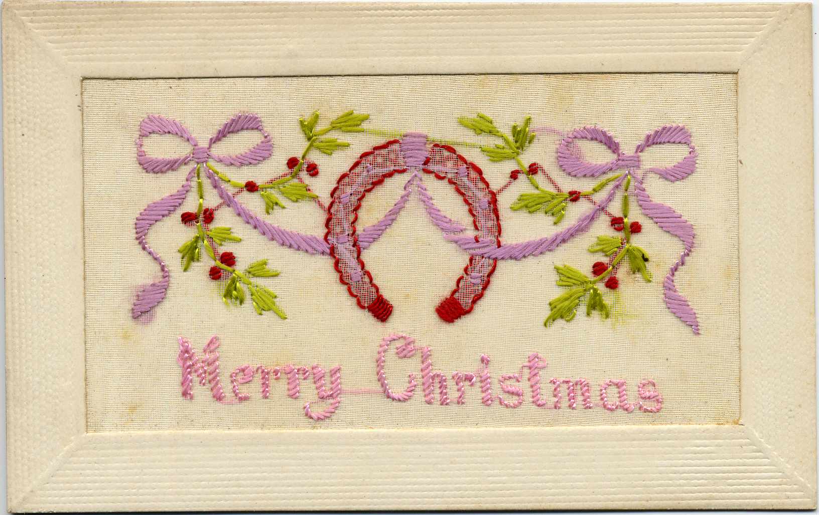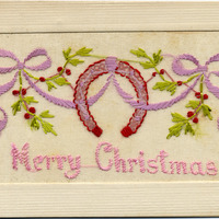This postcard has an embroidered wreath, ribbons, and holly with "Merry Christmas" embroidered beneath them. On reverse: "Embroidery"; "PH. & A."