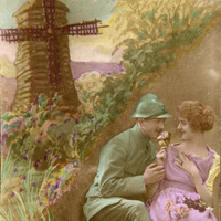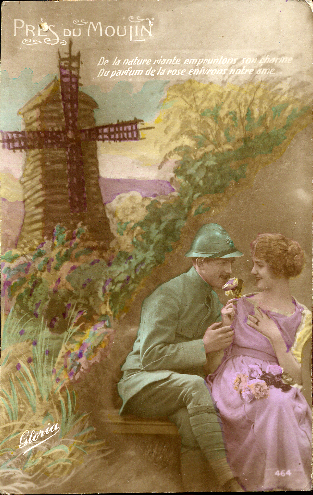 This postcard is a sepia-toned, color-tinted picture of a soldier and a woman sitting on a bench. He is smelling a rose in her hand and there is a windmill in the background. Text at top left: "Près du Moulin". Text at top right: "De la nature riante empruntons son charine/Du parfum de las rose enivrons notre áme." Text at bottom left: "Gloria". On reverse: handwritten message. Faint printing on the back says "Tirage Dr[e]mure Lico, Boulogne, Paris/Vis Paris, No. ad verso."