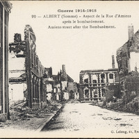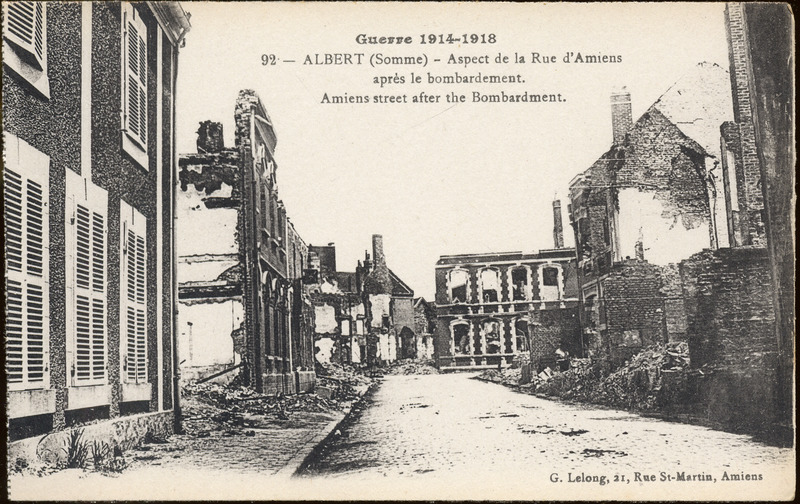 - This postcard is a black and white photo of ruins along a street. Text at top center: "Guerre 1914-1918/92--Albert (Somme) - Aspect de la Rue d'Amiens/après le bombardement./Amiens street after the Bombardment." Text at bottom right: "G. Lelong, 21, Rue St-Martin, Amiens". On reverse: "Imp. Catala Frères, Paris."