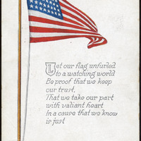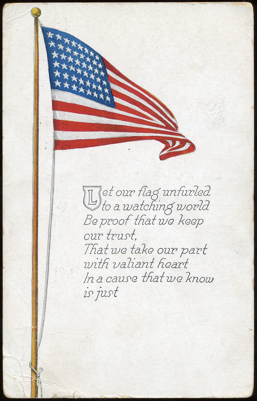 - This postcard has a color illustration of the American flag and a short poem stating its significance as proof of valiance to the rest of the world. On reverse: handwritten message; "Published by the Gibson Art Company - Cincinnati".