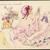 - This postcard is a color drawing of a woman lying in bed and looking at a picture of a soldier. Text at top left: "Ton souvenir me console". Text at bottom right: "Xavier Sager". On reverse: "Paris." "Tendresses/Par X Sager" "Serie No. 28" [Fantaisies Parisiennes]/Aquarellées