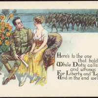 - This postcard has a color drawing of a soldier and a woman sitting next to a large vase of roses. In the background is a troop of soldiers marching. Text at bottom right: "Here's to the one that holds me true while duty calls and wrongs are righted, for liberty and love shall win and in the end we'll be united." On reverse: "© Illustrated Postal Card & Nov. Co. N.Y."; "Printed in the U.S.A."