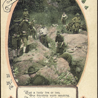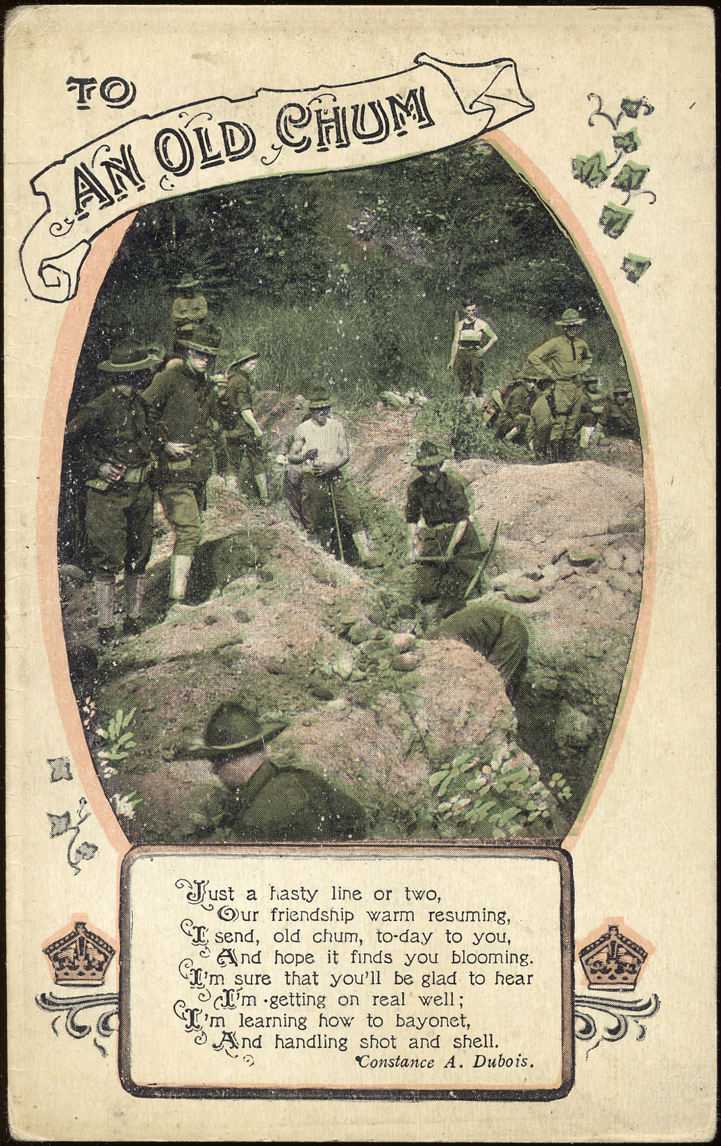 - This postcard has a green-tinted picture of soldiers digging in the ground. Beneath the picture is a poem about friendship by Constance A. Dubois. Text at top left: "To an Old Chum". On reverse: "Bamforth & Co. Ltd. Publishers Holmfirth (England) and New York."