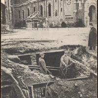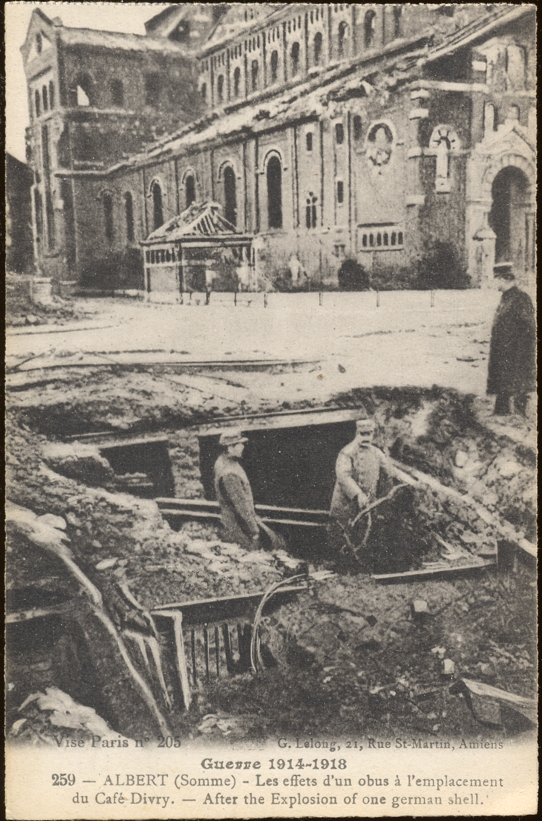 - This postcard is a black and white photo of two men standing in a hole caused by an explosion. Text at bottom center: "Guerre 1914-1918/259--Albert (Somme) - Les effets d'un obus à l'emplacement/du Café Divry. --After the Explosion of one german shell." Text at bottom left: "Visé Paris No 81". Text at bottom right: "G. Lelong, 21, Rue St-Martin, Amiens". On reverse: "Imp. Catala Frères, Paris."