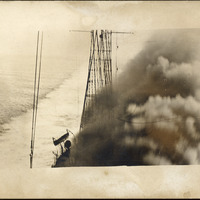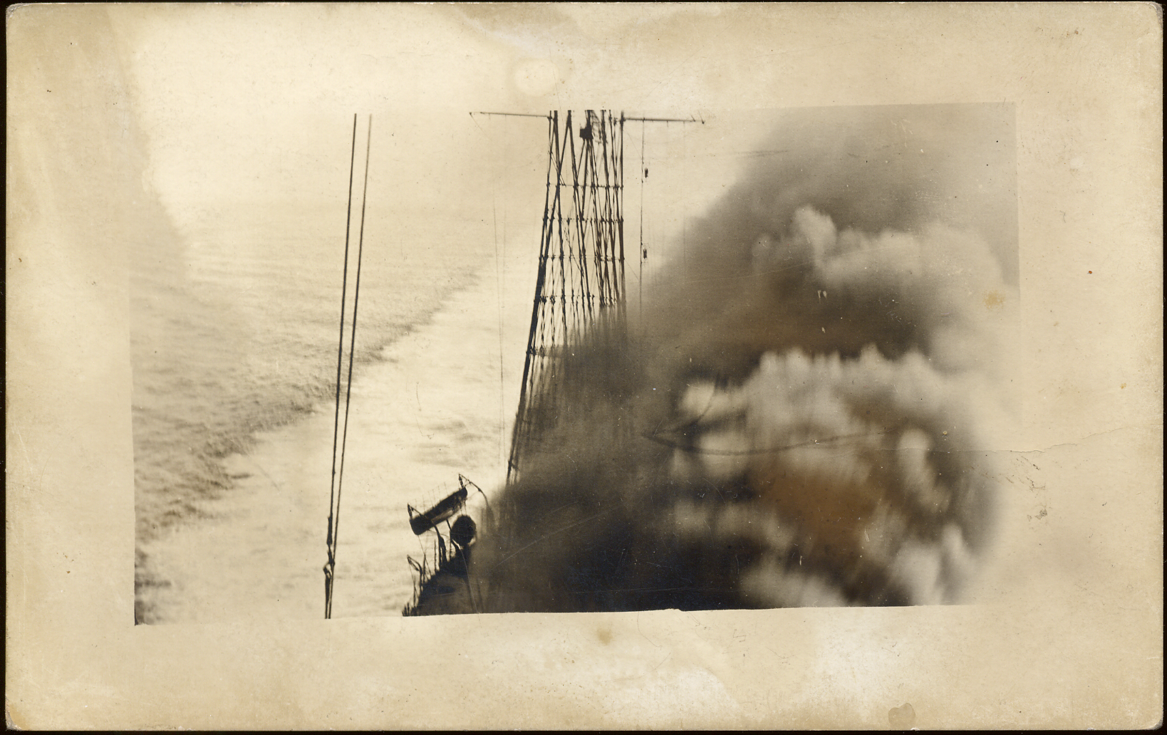 This postcard is a black and white photo of a mast partially covered up by smoke. On reverse: blank.