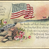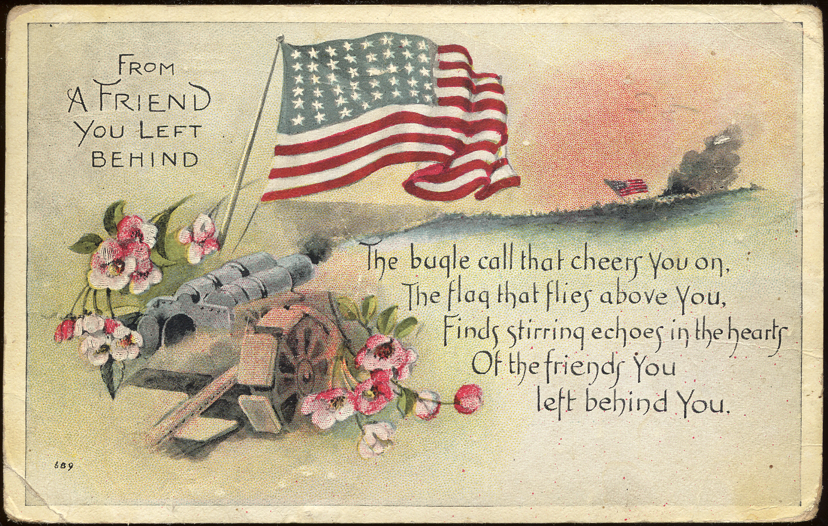 - This postcard has a color illustration of an American flag, a cannon, and a battlefield in the distance. Text at top left: "From A Friend You Left Behind". In the bottom right corner are some verses which say that the bugle and the flag stir the hearts of friends left behind. On reverse: handwritten message; "No. 689 War Mottoes with U.S. Flags--12 designs".
