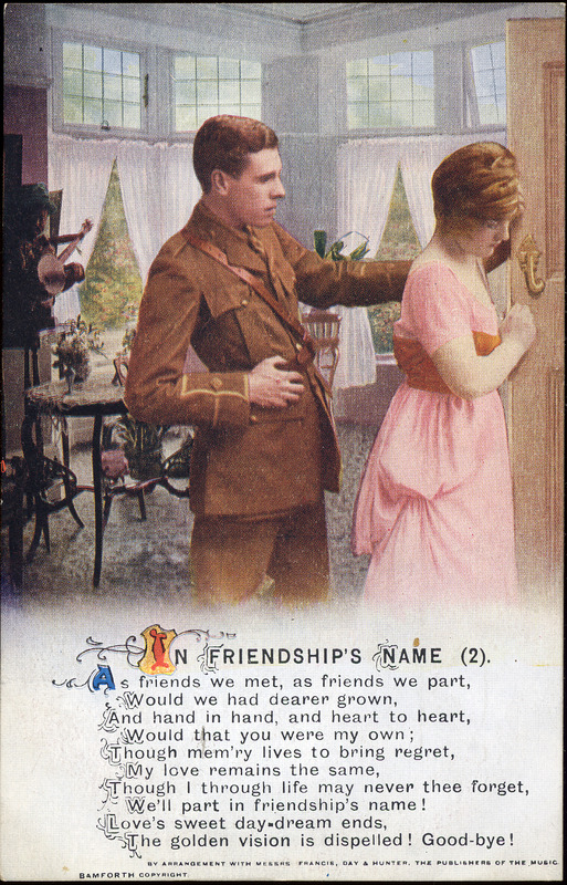 This postcard has a color illustration of a woman walking away from a soldier, out of a room. Beneath the picture is a poem entitled "In Friendship's Name (2)". It says that they part in friendship's name, although they loved each other. Text at bottom: "Bamforth copyright. By arrangement with Messrs. Francis, Day and Hunter, the publishers of the music." On reverse: "Bamforth and Co., LTD., Publishers Holmfirth (England) and New York."; "'Songs' Series. No. 4962/2 Printed in England."