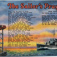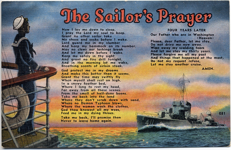 - This postcard has a color illustration of a sailor and a ship. It also has a variation of the prayer "Now I lay me down to sleep..." which is entitled "The Sailor's Prayer." On reverse: "Natural Color Post Card Made in U.S.A. by E.C. Kropp Co., Milwaukee, Wis.-(Caz)"; handwritten message.
