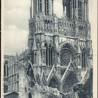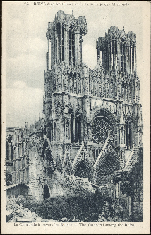 - This postcard is a black and white photograph of a cathedral among ruins. Text at top center: "63. Reims dans le Ruines après la Retraite des Allemands". Text at bottom center: "La Cathédrale travers les Ruines--The Cathedral among the ruins. Text on left side: "G. Graff edit. Reims". On reverse: blank.