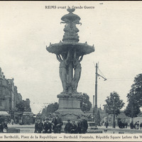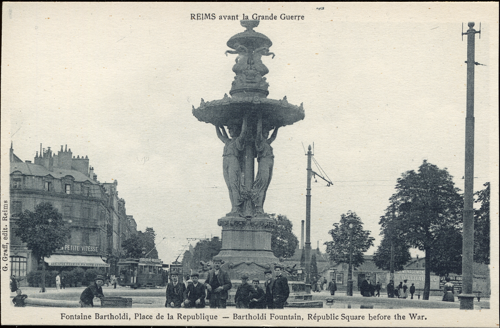 - This postcard is a black and white picture of a large fountain with statues in it. Text at top center: "Reims avant la Grande Guerre". Text at bottom center: "Fontaine Bartholdi, Place de la Republique -- Bartholdi Fountain, Républic Square before the War." Text on left side: "G. Graff edit. Reims". On reverse: blank.