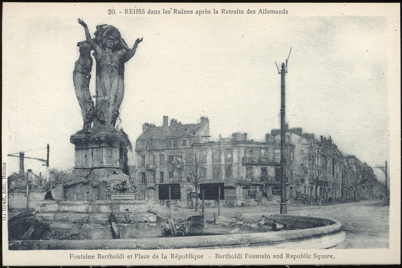 This postcard is a black and white picture of a large fountain of statues. Ruined buildings are in the background. Text at top center: "20. Reims dans les Ruines après la Retraite des Allemands". Text at bottom center: "Fontaine Bartholdi et Place de la Republique -- Bartholdi Fountain and Républic Square." Text on left side: "G. Graff edit. Reims". On reverse: blank.