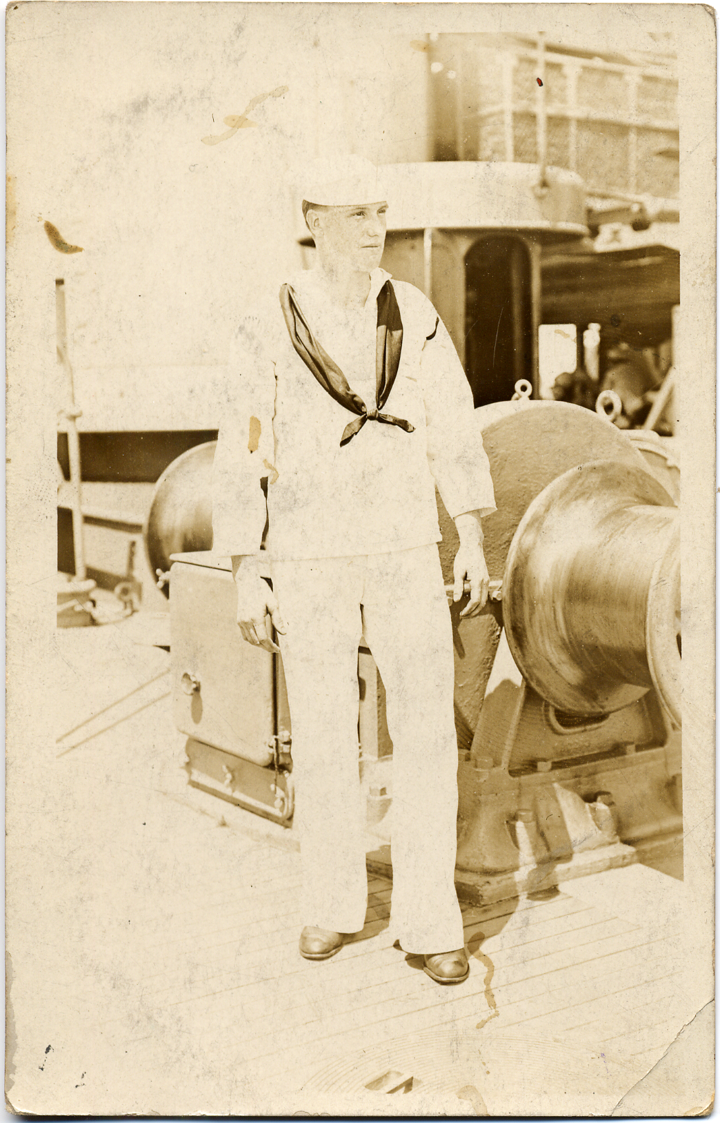 This postcard is a black and white photo of a sailor on a ship, looking to the side of the camera. On reverse: handwritten message.