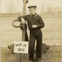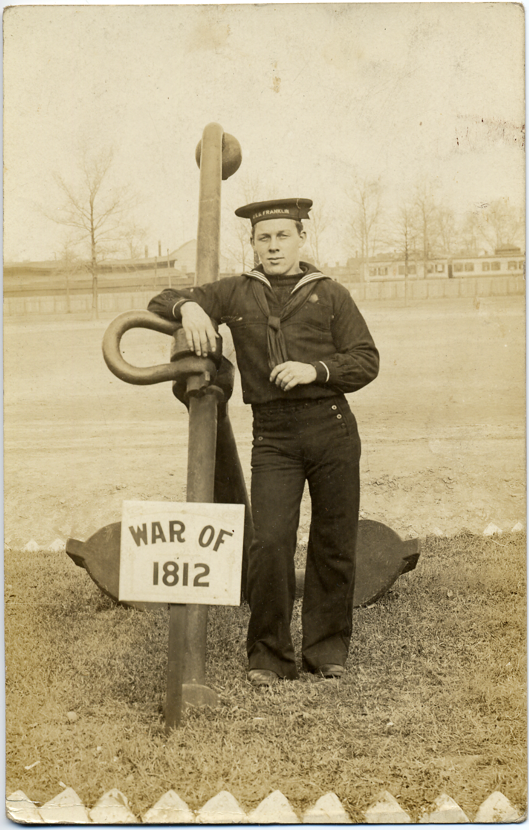 This postcard is a black and white photo of a sailor, in a dark uniform, standing next to an iron apparatus that has the sign "War of 1812" on it. On reverse: blank.