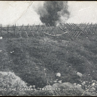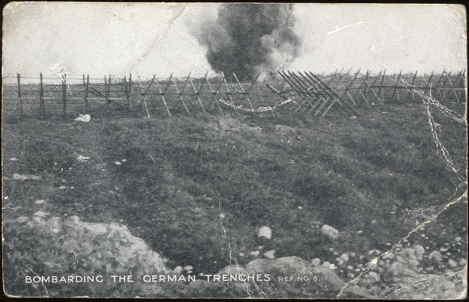 This postcard is a black and white photo of bombs being dropped in a field. Text at bottom left: "Bombarding the German Trenches"; "Ref. No. 8." On reverse: "Official photograph taken by permission of the commander-in-chief B.E.F. and passed by the chief field censor for publication. (Crown Copyright Reserved). Produced by the Photochrom Co., LTD., London and Tunbridge Wells."; "Printed in England"; handwritten message.