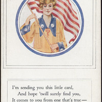 - This postcard has a color illustration of a woman holding an American flag. Beneath the picture are a few verses of hope from the girl the soldier left behind. On reverse: "Pub. By Christy Col. Print. Eng. Inc. Rochester N.Y. Series No. 1".