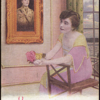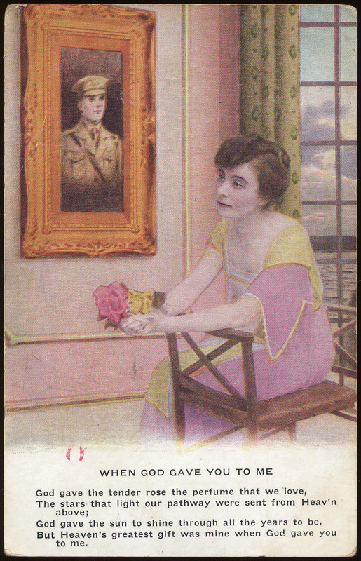 - This postcard has a color illustration of a woman sitting in a chair with flowers in her hands. On the wall beside her hangs a portrait of a soldier. Beneath the picture is a short poem entitled "When God Gave You to Me". It states that Heaven's greatest gift was when God gave "you to me." On reverse: "The two cents placed here speeds your boy a word of cheer." Handwritten message.
