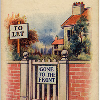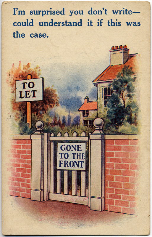 - This postcard has a color drawing of a house's front gate. A sign that says "Gone to the Front" is on the gate. Another sign that says "To Let" is above the gate. Text at top center: "I'm surprised you don't write--could understand if this was the case." On reverse: handwritten message.