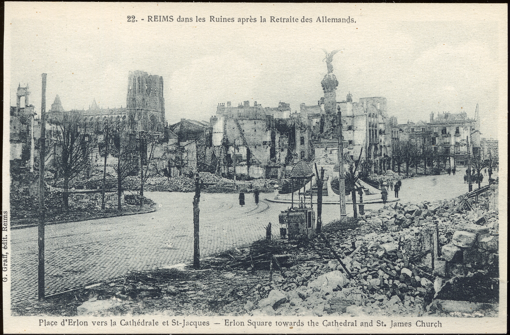 This postcard is a black and white picture of ruins in the square. Text at top center: "22. Reims dans les Ruines après la Retraite des Allemands." Text at bottom center: "Place d'Erlon vers la Cathédrale et St-Jacques--Erlon Square towards the Cathedral and St. James Church". Text on left side: "G. Graff edit. Reims". On reverse: blank.