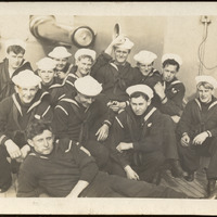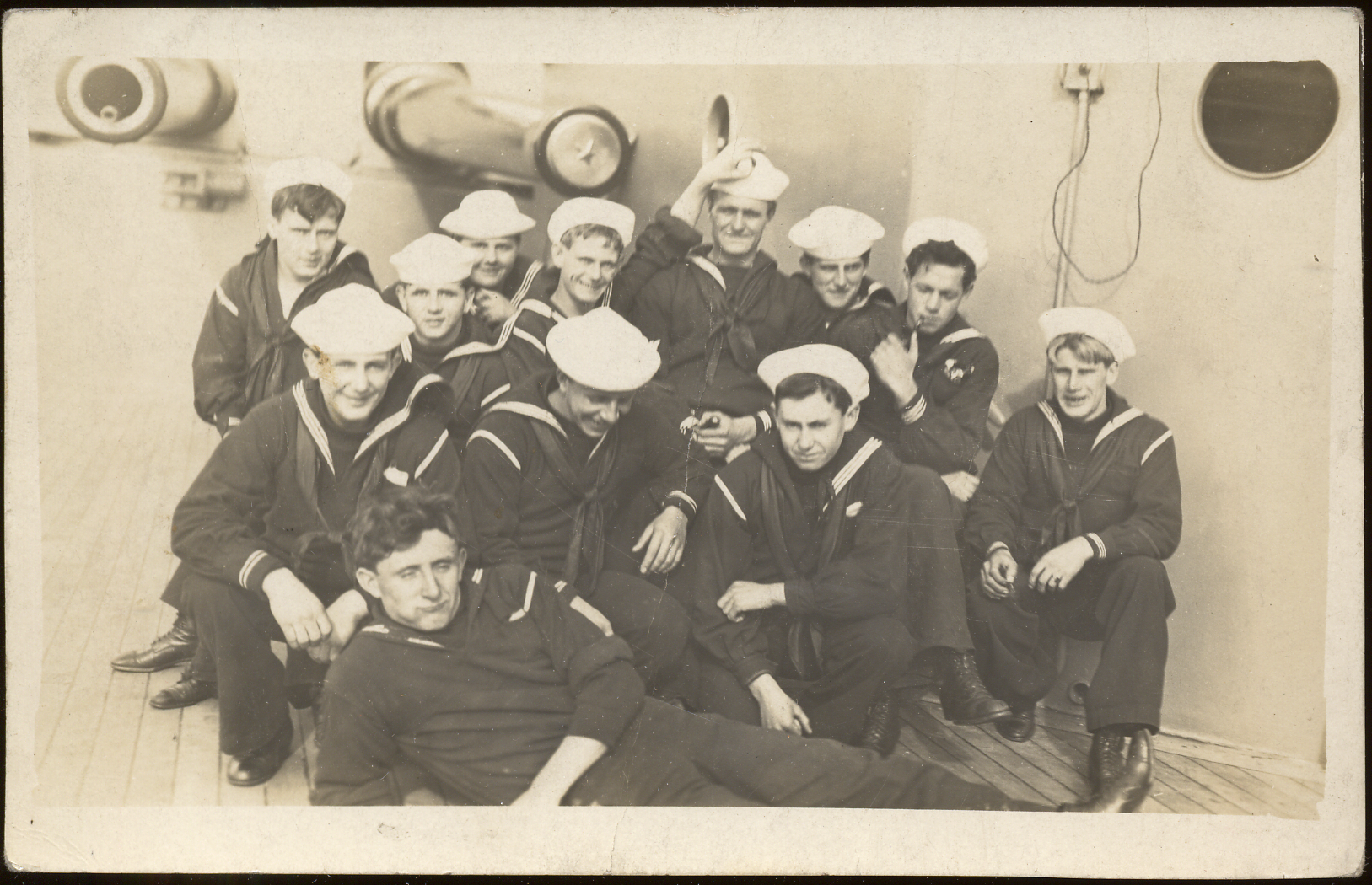 This postcard is a black and white group photo of sailors in dark uniforms. On reverse: blank.