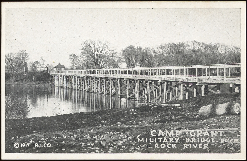 - This postcard is a black and white photo of a wooden bridge over a river. Text at bottom left: "© 1917 R.I.C.O." Text at bottom right: "Camp Grant Military Bridge Over Rock River". On reverse: "Published by the Photo-Post Card Co., Rockford, ILL."