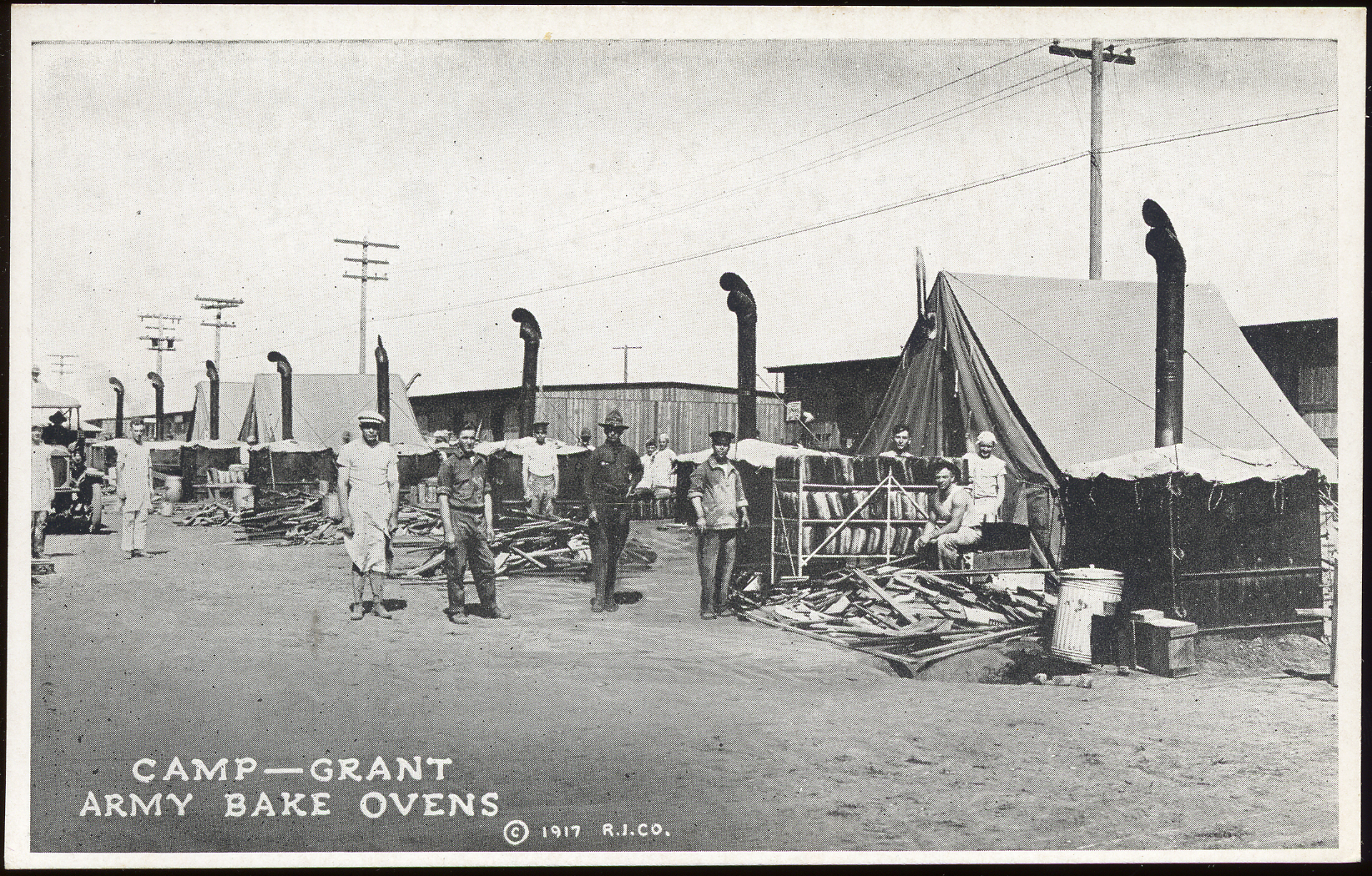 - This postcard is a black and white photo of soldiers standing by the ovens in their camp. Text at bottom left: "Camp--Grant Army Bake Ovens"; "© 1917 R.I.C.O." On reverse: blank.