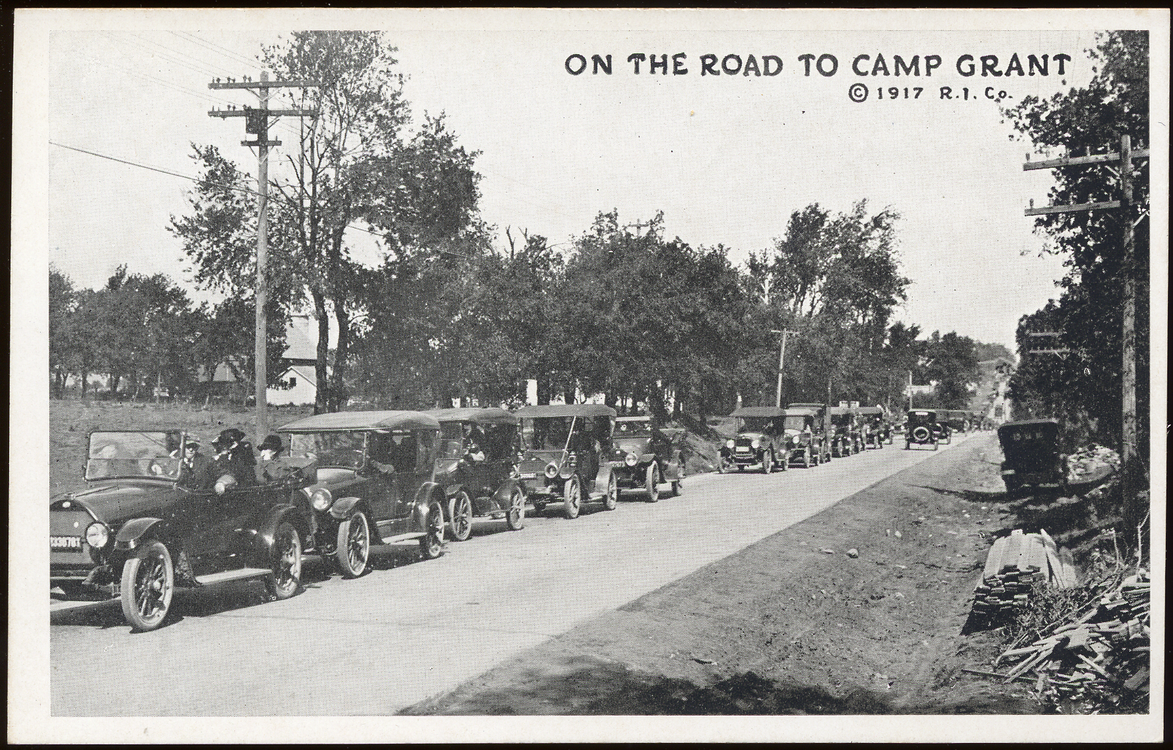 - This postcard is a black and white photo of cars lined up on a road. Text at top right: "On The Road To Camp Grant"; "© 1917 R.I.C.O." On reverse: blank.