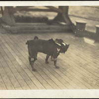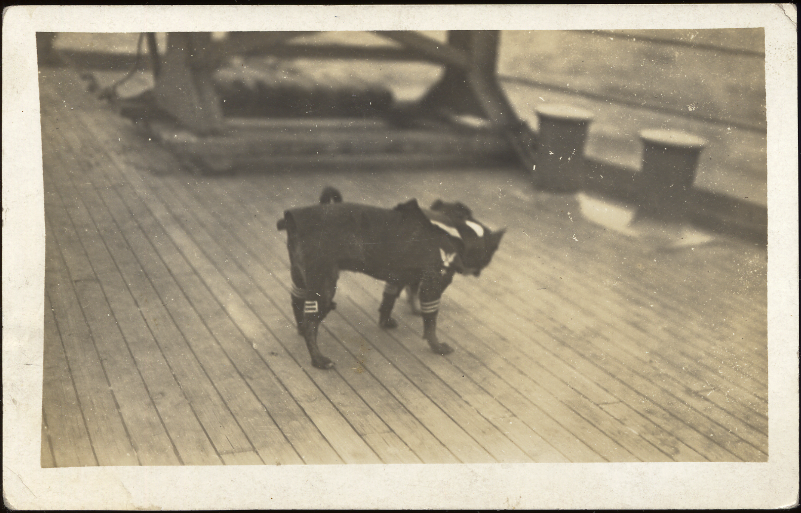 This postcard is a black and white photo of a small, black dog in a sailor uniform. On reverse: blank.