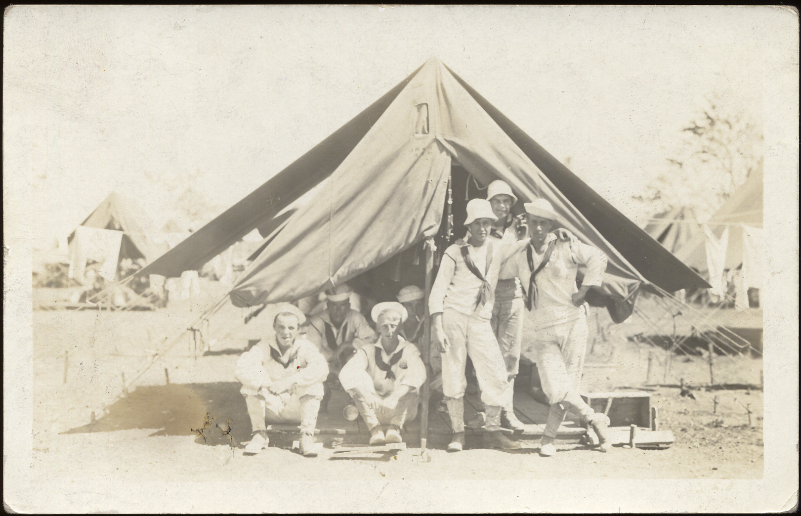 This postcard is a black and white photo of some sailors posing in front of a tent. On reverse: blank.
