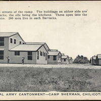 This postcard is a black and white drawing of the outside of the barracks at Camp Sherman. Text at top center: "1967 The back streets of the camp. The buildings on either side are the Barracks, the ells being the kitchens. These open into the mess rooms. 200 men live in each Barracks." Text at bottom center: "U.S. National Army Cantonment--Camp Sherman, Chilicothe, O." On reverse: blank.