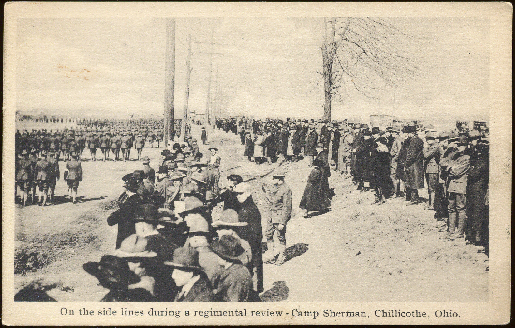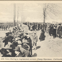 - This postcard is a black and white photo of people watching the regimental review at Camp Sherman. Text at bottom center: "On the side lines during a regimental review - Camp Sherman, Chillicothe, Ohio." On reverse: "Photo by The Corte-Scope Co., Cleveland, Ohio".