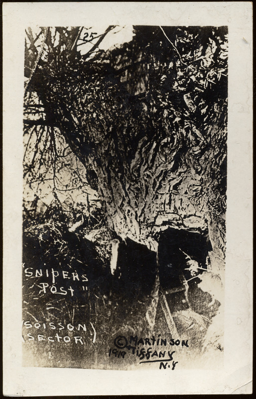 - This postcard is a black and white photo of a sniper's post on the ground. Text at bottom left: "'Sniper's Post' (Soisson Sector)". Text at bottom right: "© 1919 Martinson Tiffany N.Y." On reverse: blank.