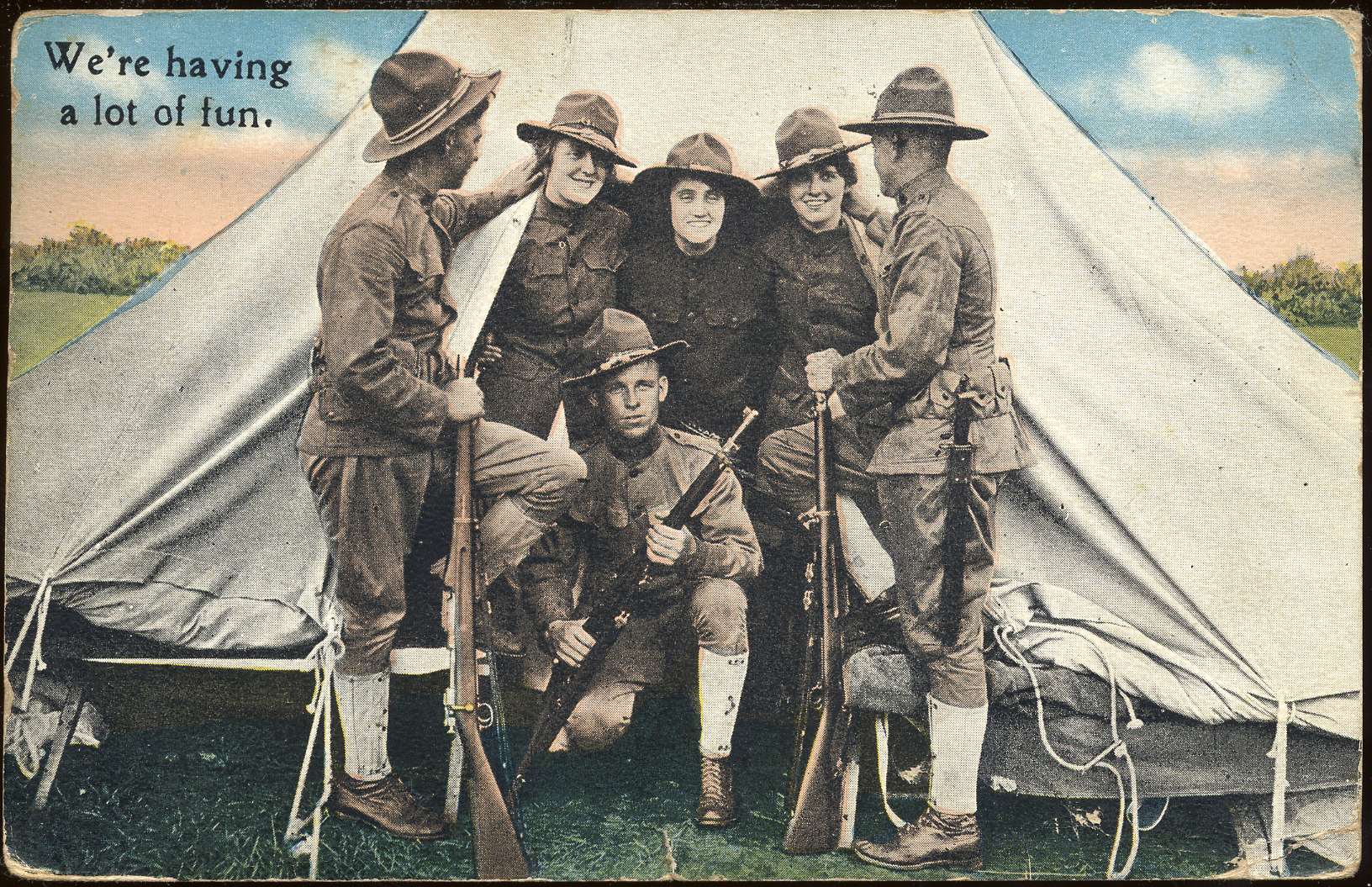 - This postcard is a color-tinted photo of six soldiers, three men and three women, posing in front of a tent. Text in top left: "We're having a lot of fun." On reverse: handwritten message.