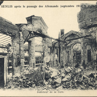- This postcard is a black and white picture of ruins. Text at top center: "Senlis après le passage des Allemands (septembre 1914)." Text at bottom left: "Visé Paris No 15". Text at bottom center: "Intérieur de la Gare." On reverse: "Imp. Phot. Neurdein Et Cie. --Paris."
