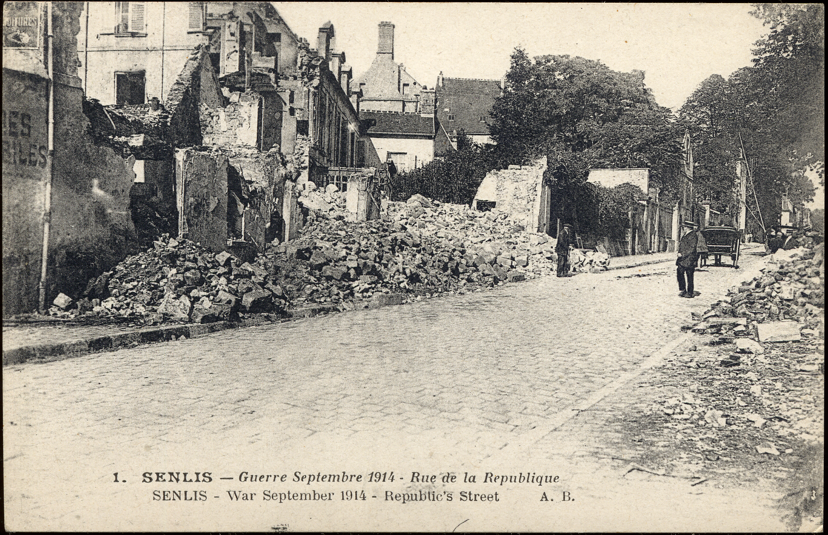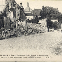 - This postcard is a black and white picture of ruins on a street. Text at bottom: "1. Senlis -- Guerre Septembre 1914 - Rue de la Republique/Senlis - War September 1914 - Republic's Street. A.B." On reverse: "Imp. A. Faucheux, Chelles."; "Bouillon, edit. 128, Rue des Courounes, Paris".
