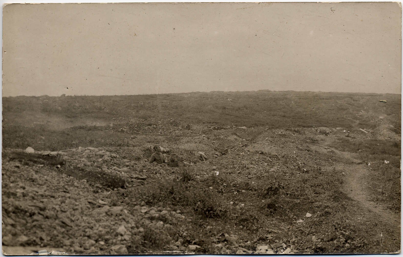This postcard is a black and white photo of two soldiers in a well-hidden trench. On reverse: handwritten message.