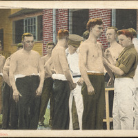 - This postcard is a color-tinted picture of soldiers receiving typhus shots. Text at bottom left: "Typhus Inoculation". On reverse: "© Illustrated Postal Card & Nov. Co., N.Y."; handwritten message.