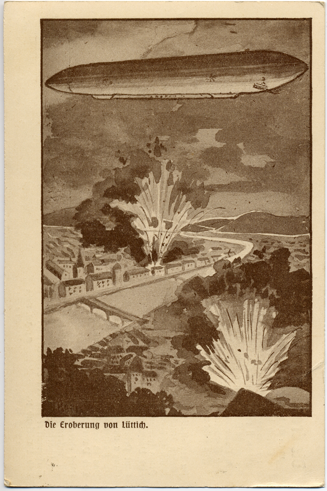 - This postcard is a black and white drawing of a zeppelin dropping bombs on a city. Text at bottom left: "Die Eroberung von Lüttich." On reverse: a lengthy passage in German.