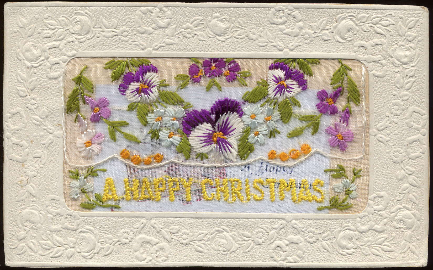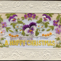 - This postcard has purple, embroidered flowers and "A Happy Christmas" embroidered along the bottom. The postcard also functions as an envelope with a small card inside. The card has an illustration of a house and a rose, along with the text, "A Happy Christmas". On reverse: "Modèle Déposé"; "Visé Paris"; "Fabrication Française"; handwritten message.