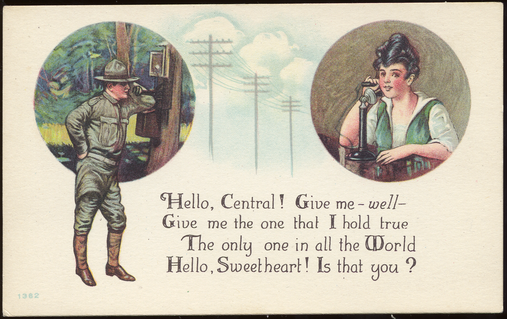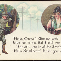 - This postcard has a color illustration of a soldier and a woman each at a phone, separated by power lines. Text at bottom center: "Hello, Central! Give me-well- / Give me the one that I hold true / The only one in all the World / Hello, Sweetheart! Is that you?" On reverse: "© Illustrated Postal Card & Nov. Co. N.Y."; "Printed in the U.S.A."