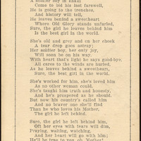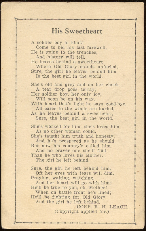 - This postcard has a poem entitled "His Sweetheart" by Corp. R. H. Leach. In the poem, the "sweetheart" is actually the soldier's mother, whom he has to leave behind. Text beneath poem: "(Copyright applied for.)" On reverse: "Searls Advertising Co., Waco, Texas".