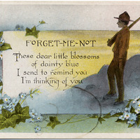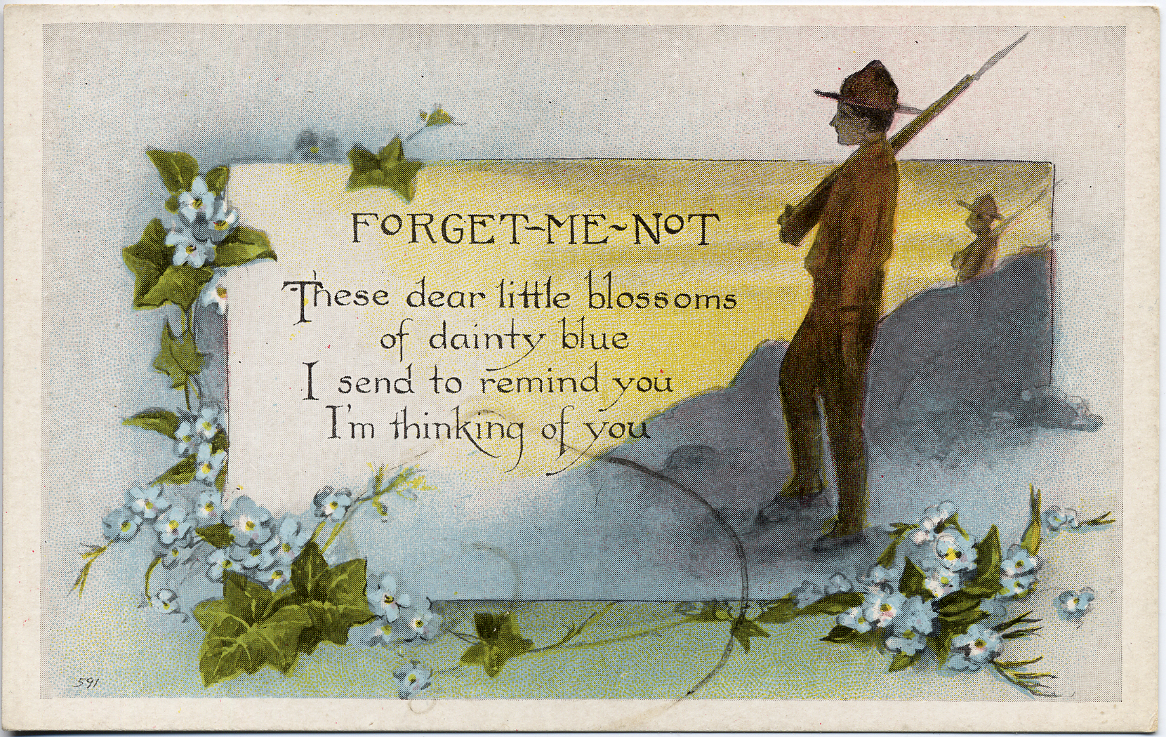 - This postcard has verses entitled "Forget-Me-Not" with blue flowers on the left and two soldiers on the right. Text: "These dear little blossoms/of dainty blue/I send to remind you/I'm thinking of you". On reverse: "Series 591 Soldier Message, 12 des."