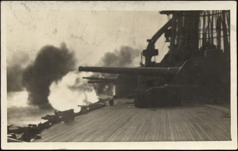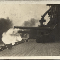 This postcard is a black and white photo of cannons firing from a ship. On reverse: blank.